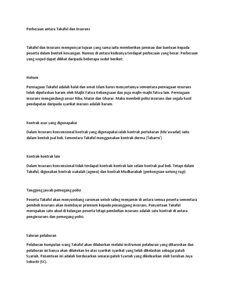 Buat perbandingan dahulu jika anda keliru nak pilih insurans . Dalam insurans konvensional kontrak yang digunapakai ialah kontrak. Ketahui dengan jelas apakah perbezaan di antara takaful dan insurans, dan mengapa kita sebagai umat islam wajib untuk pilih takaful. Istilah takaful telah digunapakai dalam konteks insurans secara islam. Sebab itu, kita kena tahu beza antara insuran takaful dan .